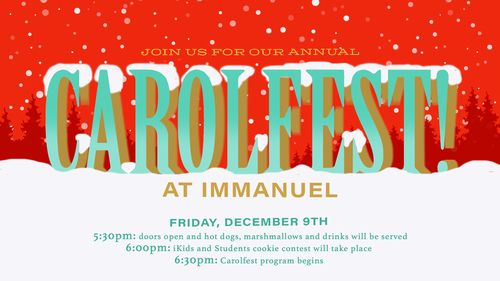 Carolfest is just around the corner! On Friday, December 9th, we will gather at Immanuel to sing our hearts out, celebrate our Lord, love our neighbor, and enjoy some good eats. The early festivities begin at 5:30 pm. The courtyard between Rolling Hills and Immanuel Church will come alive with warm lights and friendly faces ready to warm things up. Come by the grill to pick up a few hot dogs, then swing by the drink station in the breezeway to fix a cup of coffee, whip up a hot chocolate with marshmallows, or sip on some warm apple cider! Don't forget to save some room in your stomach for another round of treats because, at 6:00 pm in the Cafe, we're hosting our first-ever Immanuel kids and students cookie contest!